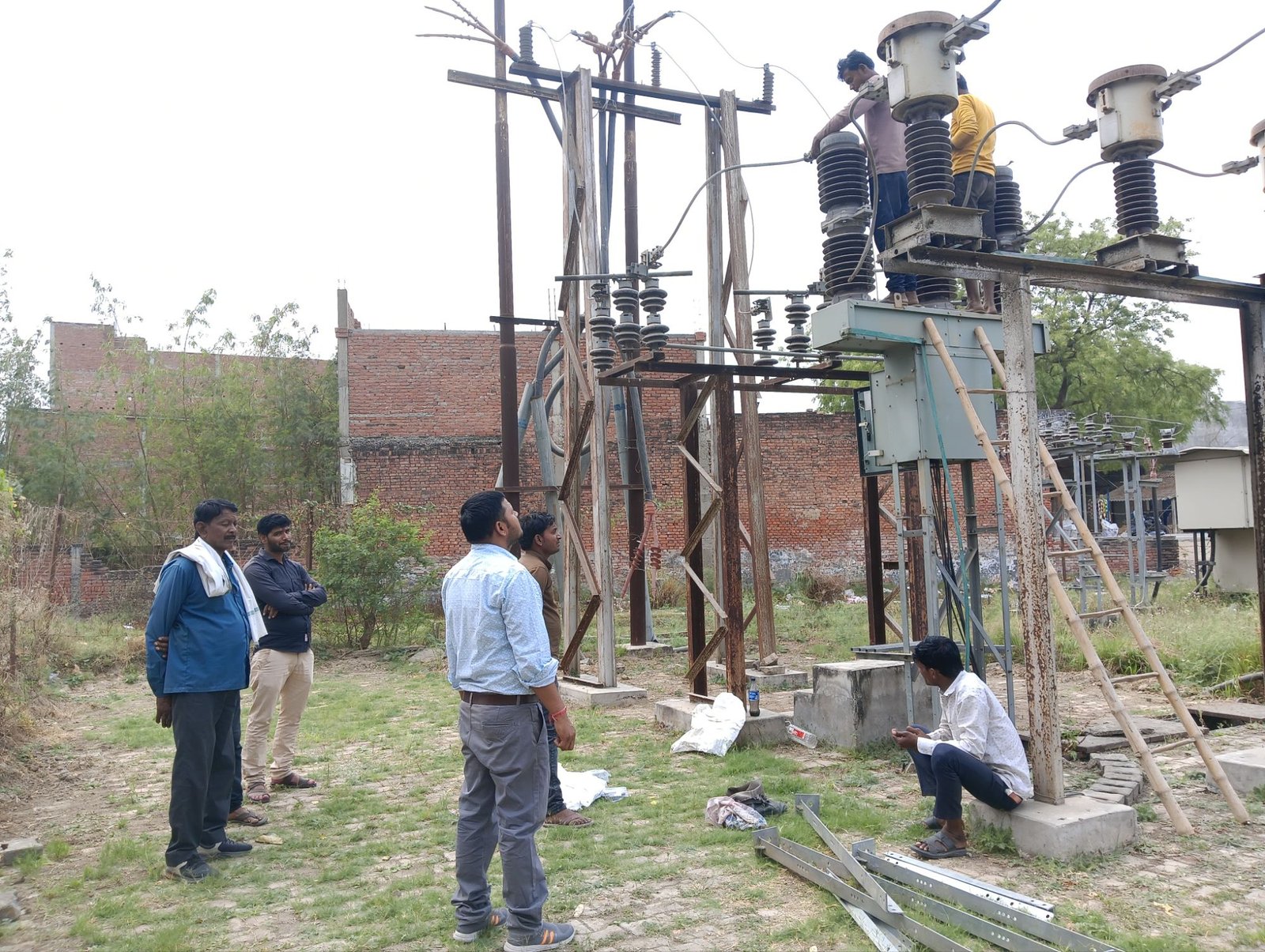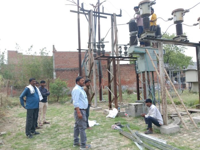 सकलडीहा तहसील बिजली उपकेन्द्र के स्वीच यार्ड में ब्रेकर लगाते बिजली कर्मी