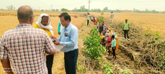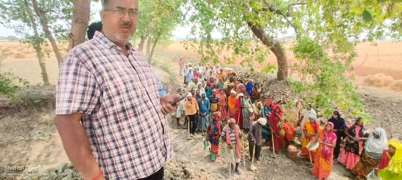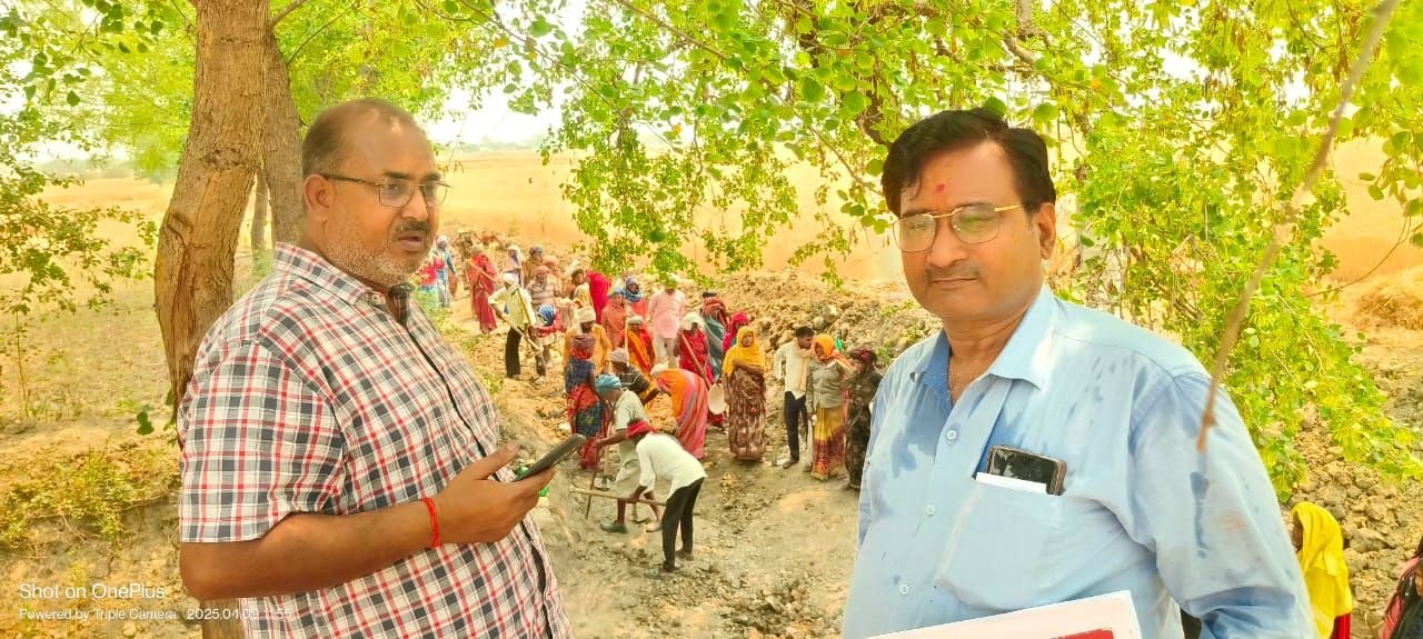 डीसी मनरेगा आरके चतुर्वेदी मनरेगा कार्य का निरीक्षण करते हुए साथ में बीडीओ विजय सिंह