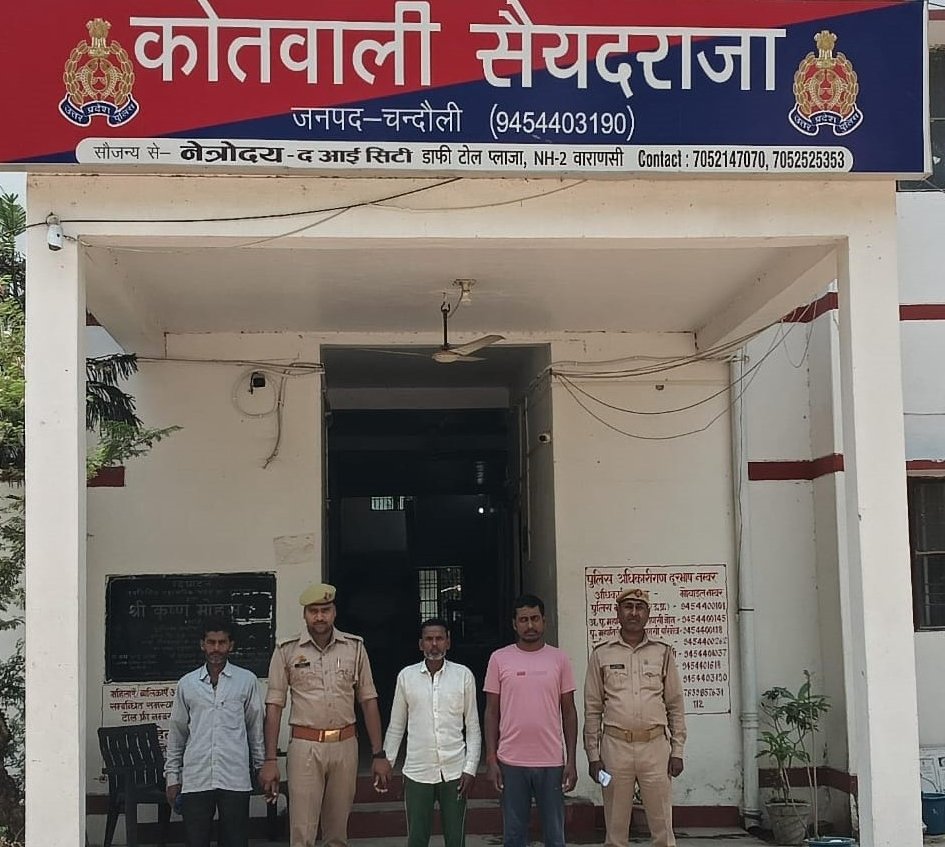 चन्दौली ।महानिरीक्षक परिक्षेत्र वाराणसी मोहित गुप्ता के निर्देशन में पुलिस अधीक्षक चन्दौली आदित्य लांग्हे द्वारा वांछित वारण्टी अपराधियों की गिरफ्तारी हेतु चलाये जा रहे अभियान के क्रम में अपर पुलिस अधीक्षक सदर अनन्त चन्द्रशेखर व क्षेत्राधिकारी सदर राजेश राय के कुशल पर्यवेक्षण में प्रभारी निरीक्षक बिन्देश्वर प्रसाद पाण्डेय मय हमराह के साथ वारन्टी अभियुक्तगण 1. विनोद पुत्र काशी निवसी ग्राम औरेया थाना सैयदराजा जनपद चन्दौली, 2. अशोक पुत्र काशी निवासी ग्राम औरेया थाना सैयदराजा जनपद चन्दौली के सम्बन्धित मु.नु. 5032/15 अ.सं. 75/15 धारा 323/325/504 भा.द.वि. में ग्राम औरेया से गिरफ्तार किया गया तथा वारण्टी 3.महेन्द्र कुमार पुत्र रामानन्द सागर नि बरठी कमरौर नौबतपुर थाना सैयदराजा चन्दौली को सम्बन्धित मु.नं.1482/22 धारा 4/5/38 एनआई एक्ट में ग्राम बरठी कमरौर गिरफ्तार कर आवश्यक विधिक कार्यवाही की जा रही हैं।