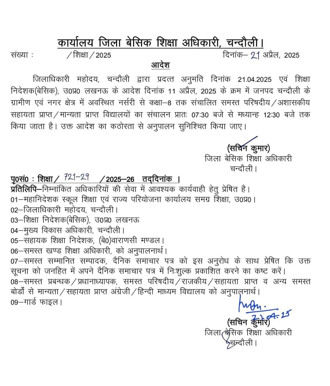 चन्दौली। जिला बेसिक शिक्षा अधिकारी सचिन कुमार ने सोमवार को बताया कि जिलाधिकारी चन्द्र मोहन गर्ग द्वारा प्रदत्त अनुमति दिनांक 21.04.2025 एवं शिक्षा निदेशक (बेसिक), उ०प्र० लखनऊ के आदेश दिनांक 11 अप्रैल, 2025 के क्रम में जनपद चन्दौली के ग्रामीण एवं नगर क्षेत्र में अवस्थित नर्सरी से कक्षा-8 तक संचालित समस्त परिषदीय/अशासकीय सहायता प्राप्त/मान्यता प्राप्त विद्यालयों का संचालन प्रातः 07:30 बजे से मध्यान्ह 12:30 बजे तक किया जाता है। उक्त आदेश का कठोरता से अनुपालन सुनिश्चित किया जाए।