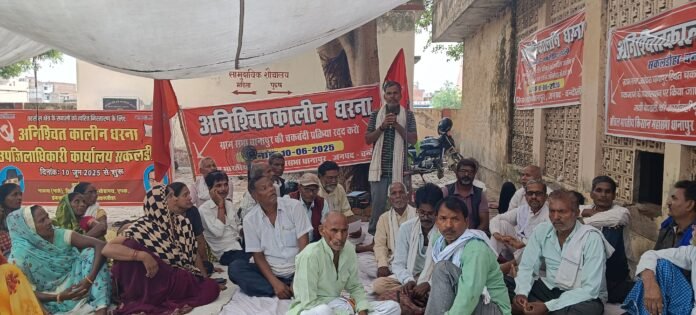 तहसील मुख्यालय पर अनिश्चित कालीन धरना पर बैठे भाकपा माले के पदाधिकारी