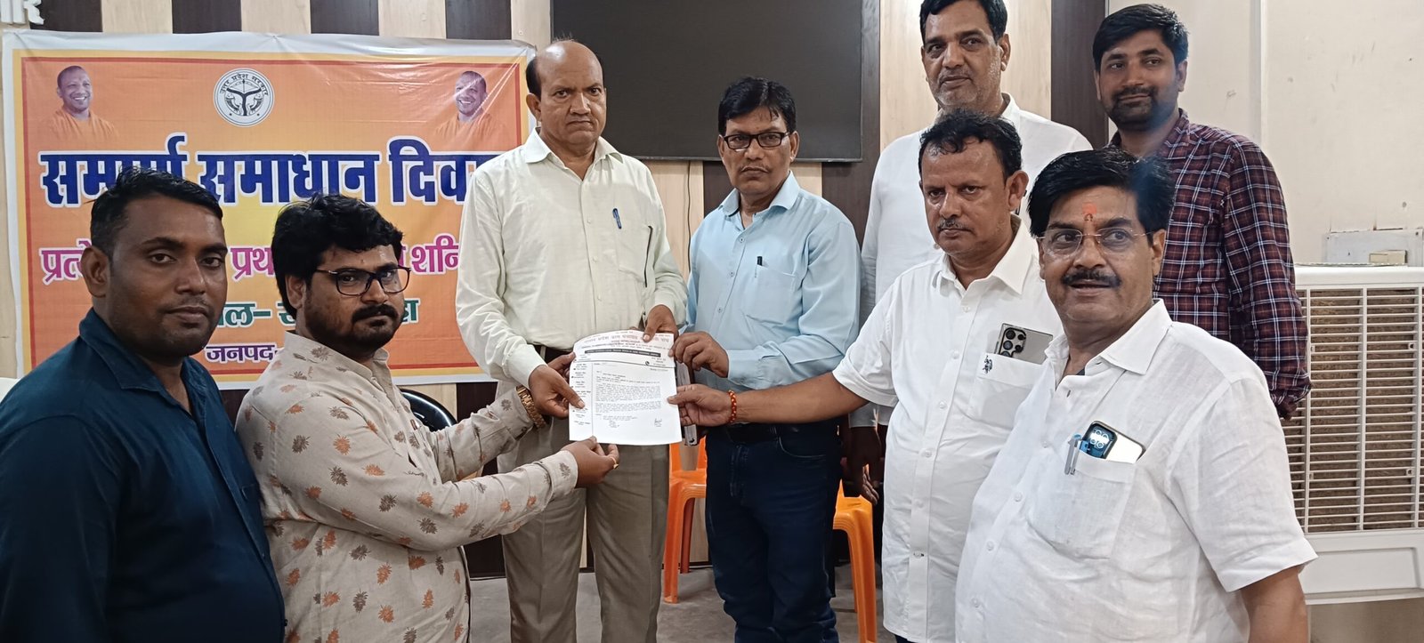 सकलडीहा में पत्रक देते उत्तर प्रदेश ग्राम पंचायत अधिकारी संघ के जिलाध्यक्ष सहित अन्य