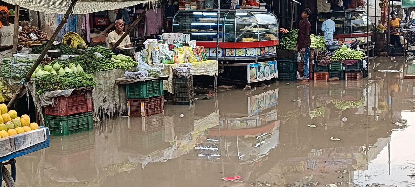 नाला निर्माण के बाद भी मुख्य मार्ग पर जलभरॉव के बीच सब्जी फल दुकानदार