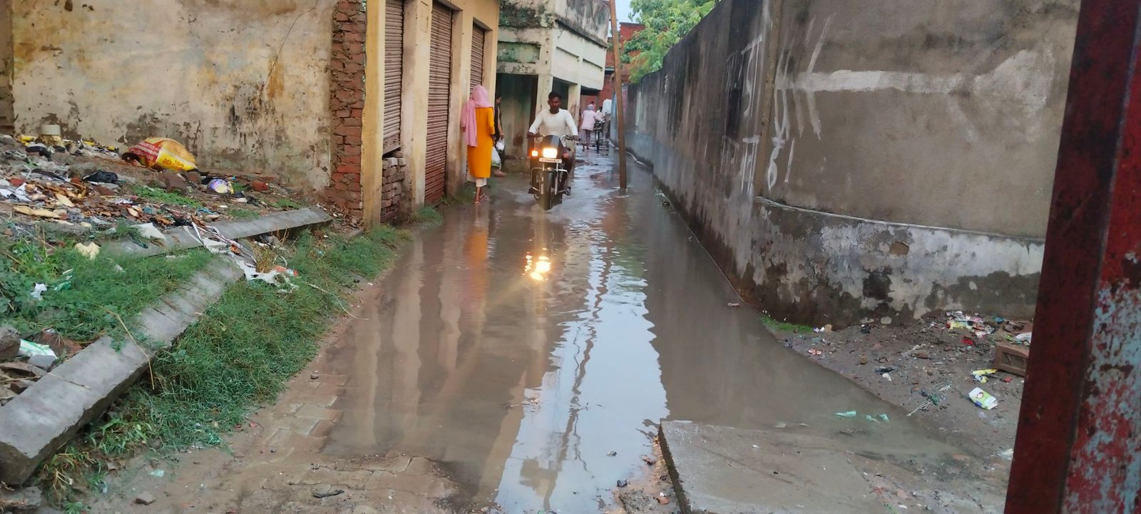 कस्बे के डोमान गली में जलभराव से फजीहत पानी मे जाते ग्रामीण