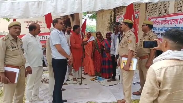 धरना स्थल पर पुलिस फोर्स के साथ भाकपा माले का पत्रक लेते नायब तहसीलदार दिनेश चन्द्र शुक्ल