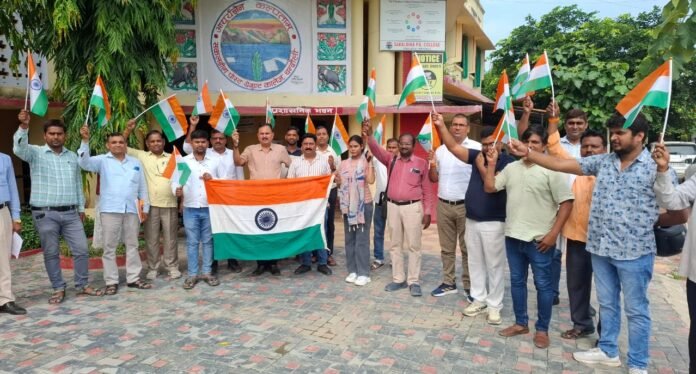 6 अगस्त को महाविद्यालय के प्राचार्य प्रोफेसर प्रदीप कुमार पांडेय के नेतृत्व में तिरंगा रैली का आयोजन किया गया। जिसमें महाविद्यालय के समस्त प्राध्यापक एवं कर्मचारी तथा छात्र-छात्राओ ने हिस्सा लिया। यह कार्यक्रम तीन चरणों में आयोजित होना है। जिसमें पहला चरण 2- 8 अगस्त, द्वितीय चरण, 9 -12 अगस्त और तृतीय चरण 13 -15 अगस्त 2025 तक विभिन्न कार्यक्रमों के माध्यम से आयोजन किया जाना है। महाविद्यालय के प्राचार्य प्रोफेसर प्रदीप कुमार पांडेय ने बताया की आने वाले दिनों में भाषण प्रतियोगिता,रंगोली प्रतियोगिता, पोस्टर प्रतियोगिता के अलावा अन्य कार्यक्रम राष्ट्रीय सेवा योजना की इकाई के माध्यम से कराया जाएगा। जिसमें छात्र-छात्राओं की भागीदारी सुनिश्चित की जाएगी। इस अवसर पर राष्ट्रीय सेवा योजना कार्यक्रम अधिकारी श्याम लाल सिंह यादव, प्रोफेसर उदय शंकर झा, प्रोफेसर इंद्रदेव सिंह, प्रोफेसर विजेंदर सिंह, प्रोफेसर महेंद्र प्रताप सिंह, प्रोफेसर समीम राईन, डॉक्टर राजेश यादव ,डॉक्टर अजय यादव, डॉक्टर इंद्रजीत ,संदीप सिंह,यज्ञ नाथ पांडेय,अजय कुमार यादव,डॉ अभय कुमार वर्मा सहित अन्य मौजूद रहे।