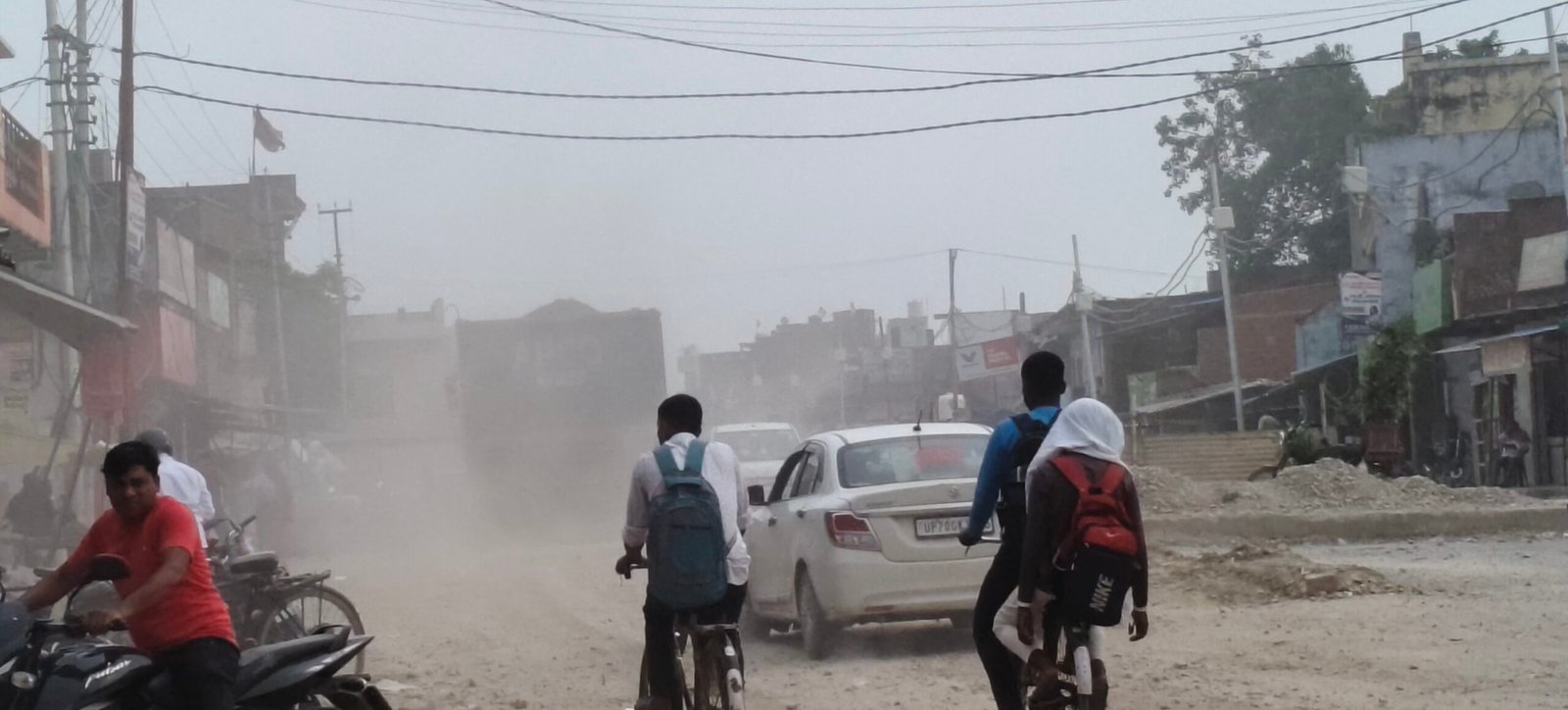 सकलडीहा में उड़ती धूल से होकर गुजरते ग्रामीण और बाइक सवार