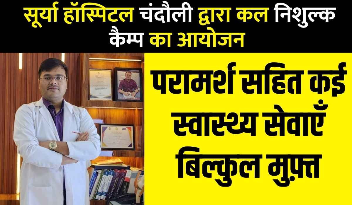 चन्दौली स्थित सूर्या हॉस्पिटल द्वारा कल यानी 9 फरवरी रविवार के दिन निशुल्क कैंप का आयोजन किया जा रहा है जहां तमाम मेडिकल सुविधाएं दी जाएगी, आपको बता दें कि इस स्वास्थ्य शिविर में निशुल्क परामर्श के साथ-साथ कई सुविधाओं का भी मरीज लाभ उठा सकते हैं।