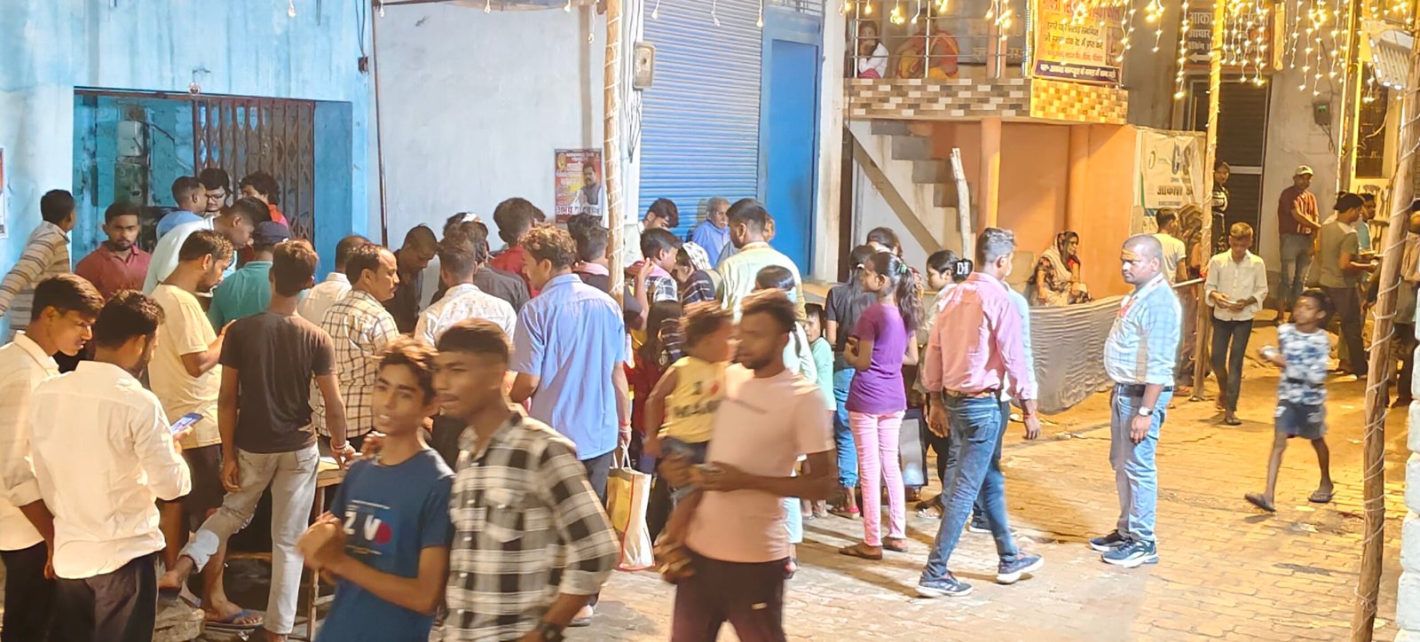 कस्बा के राजशाही मार्केट में देशी घी का प्रसाद वितरण करते हुये भक्तजन
