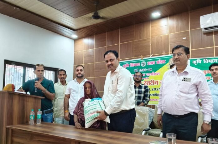 विकास खंड सभागार में किसानों को किट वितरण करते हुए जिला कृषि अधिकारी विनोद कुमार यादव व बीडीओ विजय सिंह
