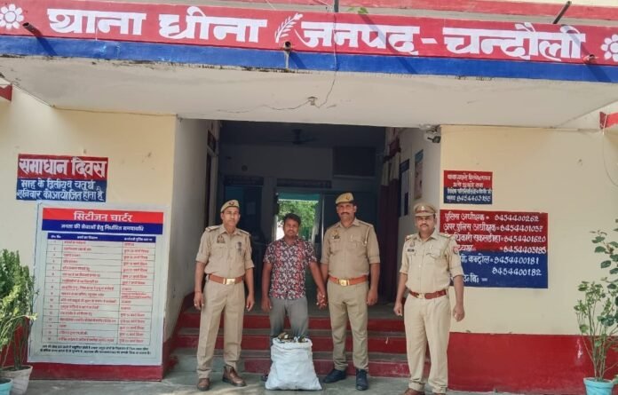चन्दौली। पुलिस अधीक्षक आदित्य लांग्हे द्वारा शराब तस्करी पर प्रभावी अंकुश लगाये जाने व अवैध शराब की तस्करी में संलिप्त अभियुक्तों की गिरफ्तारी हेतु दिये गये निर्देशों के अनुपालन के क्रम में अपर पुलिस अधीक्षक सदर अनन्त चन्द्रशेखर (आई.पी.एस.) तथा क्षेत्राधिकारी सकलडीहा स्नेहा तिवारी के कुशल पर्यवेक्षण में थानाध्यक्ष धीना भूपेन्द्र कुमार निषाद के नेतृत्व में पुलिस टीम द्वारा मुखबीर की सूचना के आधार पर रविवार को 10 बजे रेलवे स्टेशन धीना के फूट ओवर ब्रिज के कोने में शराब ले जाते समय एक अंतर्राज्यीय शराब तस्कर को गिरफ्तार किया गया। जिसके कब्जे सें अंग्रेजी शराब की कुल 144 पाउच बरामद की गई है। जिसकी अनुमानित कीमत 17500/- रूपये आंकी गयी है।गिरफ्तार किये गये अभियुक्त की पहचान मिथिलेश कुमार उर्फ बन्टी पुत्र बीरेन्द्र राम निवासी ग्राम पंचायत करंज पोस्ट जिगना थाना दिनारा जनपद राहतास बिहार उम्र करीब 24 वर्ष के रुप मे हुई हैं ।पूछताछ में गिरफ्तार अभियुक्त द्वारा बताया गया कि वह उत्तर प्रदेश के दुकानों से शराब खरीदकर अधिक लाभ कमाने के लिये ट्रेनो से शराब बिहार ले जाकर ऊँचे दामो मे बेचकर मुनाफा कमाते हैं।