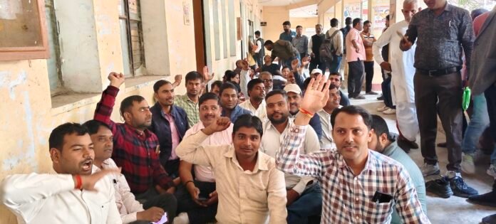 तहसील मुख्यालय पर धरना देते हुए लेखपाल संघ के पदाधिकारीगण