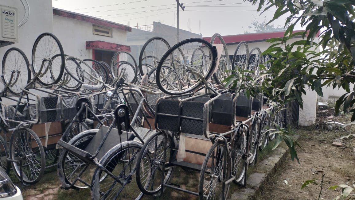 ब्लॉक परिसर में रखा दिव्यांगों को वितरण के लिये ट्राईसाइकिल