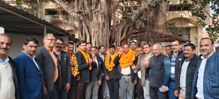 सकलडीहा। सकलडीहा डेमोक्रेटिक बार एसोसिएशन का चुनाव बुधवार को भारी गहमागहमी के बीच निर्विरोध संपन्न हुआ। जिसमें अध्यक्ष पद पर जनार्दन मिश्रा और महामंत्री पर आशुतोष कुमार मिश्रा सहित अन्य सभी पदों पर निर्विरोध चुनाव हुआ। चुनाव अधिकारी अशोक मिश्रा ने नवनिर्वाचित पदाधिकारियों की घोषणा करने पर अधिवक्ताओं ने मालाफूल से लाद दिया। अधिवक्ताओं ने मिठाई और माला पहनाकर बधाई दिया।सकलडीहा डेमोक्रेटिक बार की वार्षिक चुनाव को लेकर दोपहर बारह बजे के बाद अधिवक्ता वरिष्ठ अधिवक्ता अजय सिंह के चैंबर पर जुटने लगे थे। अध्यक्ष पद के लिये दो उम्मीदवारों का नाम अधिवक्ताओं की ओर से प्रस्तावित किया गया। काफी गहमागहमी के बीच जिसमें सर्व सम्मत से अध्यक्ष पद के लिये जनार्दन मिश्र का नाम की घोषणा होते ही सभी अन्य पदों पर निर्विरोध चुनाव कर लिया गया। जिसमें वरिष्ठ उपाध्यक्ष आशुतोष कुमार सिंह, कनिष्ठ उपाध्यक्ष अंकित तिवारी,महामंत्री आशुतोष कुमार मिश्रा,कोषाध्यक्ष विजय प्रताप सिंह पिंटू, संयुक्त सचिव सुभाष चन्द्र भारती को भी निर्विरोध चुन लिया गया। इसके अलावा कार्यकारिणी में अशोक मिश्रा,शिवकुमार सिंह,अजय कुमार सिंह,राजकुमार सिंह,संजय श्रीवास्तव,जयप्रकाश सिंह,अतुल तिवारी,रमाकांत सिंह,सच्चिदानंद सिंह,सुरेश यादव,दुर्गेश सिंह को निर्विरोध चुना गया। इस मौके पर शासकीय अधिवक्ता अजय कुमार सिंह,उपेन्द्र नारायण सिंह,गोपाल सिंह,राजेश्वर सिंह रज्जू,आलोक पांडेय सहित अन्य मौजूद रहे।