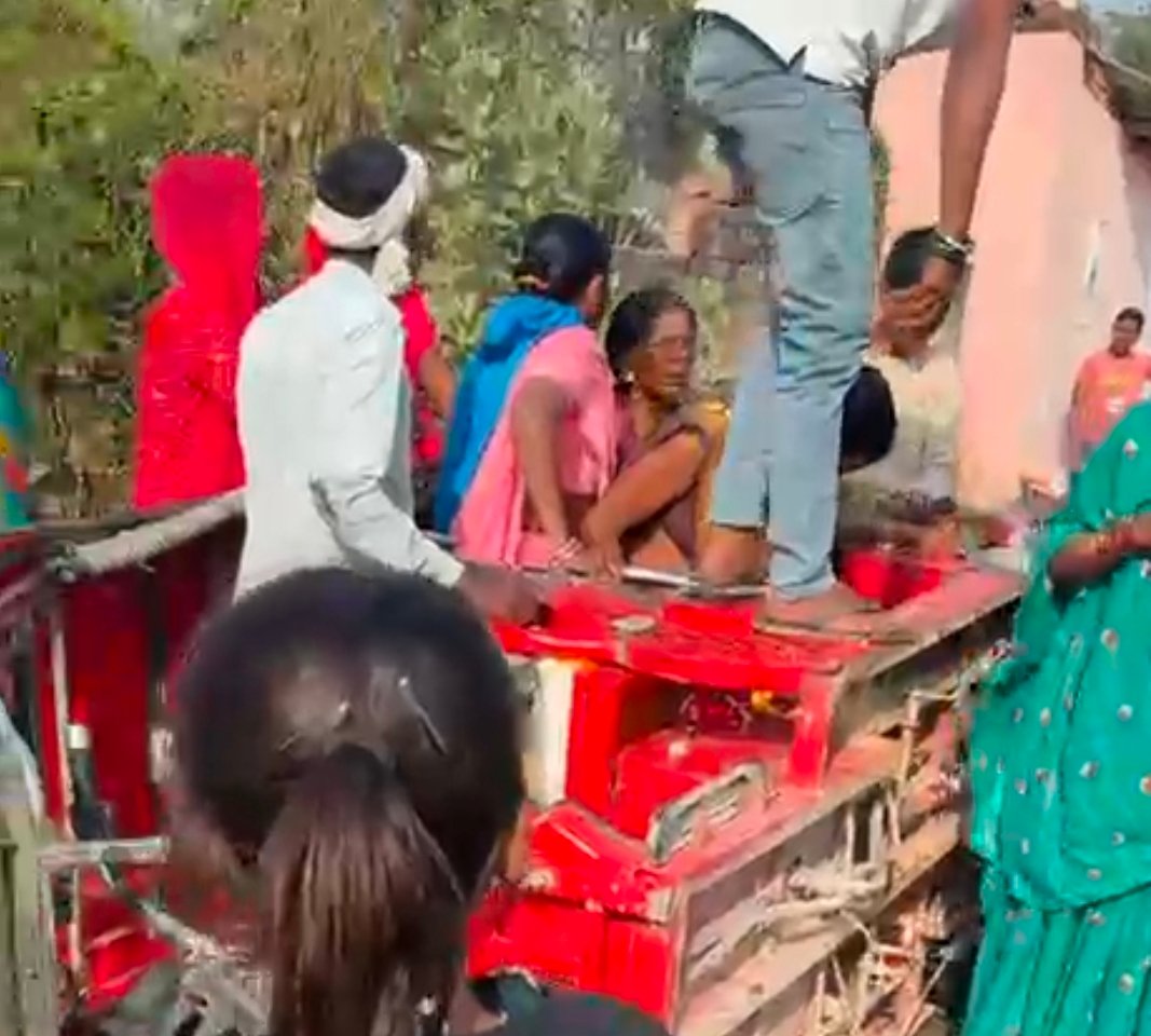 टिमिलपुर गांव के रास्ते में पलटी टोटो से निकलते लोग