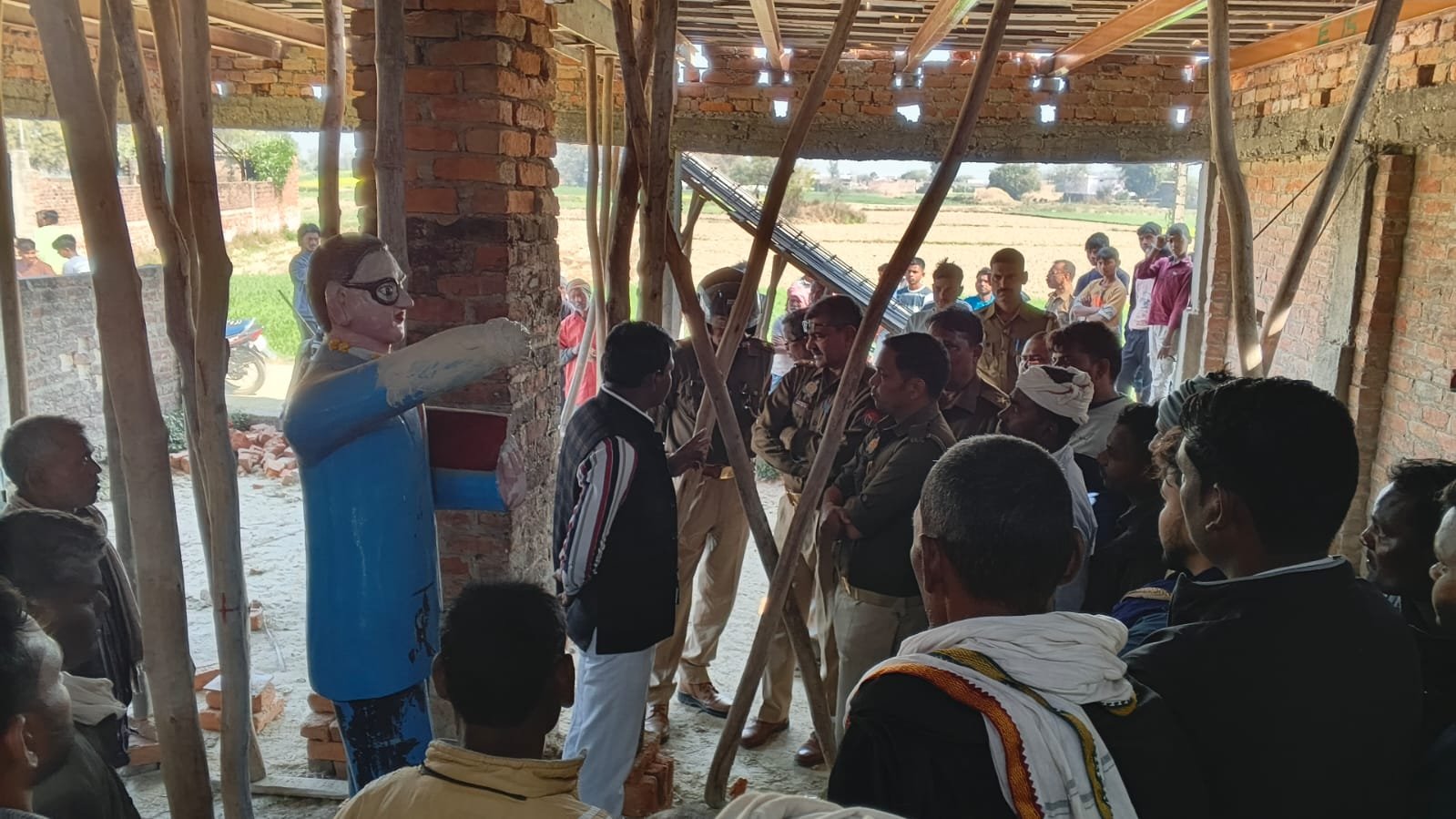 सकलडीहा। मनियारपुर गांव की दलित बस्ती में शुकवार की रात को डॉ. भीमराव आंबेडकर की प्रतिमा को अराजक तत्वों ने क्षतिग्रस्त कर दिया। सुबह जब ग्रामीणों ने प्रतिमा को टूटा देखा तो मौके पर भारी भीड़ जमा हो गई। सूचना मिलते ही सकलडीहा कोतवाली पुलिस के साथ ही धानापुर और बलुआ पुलिस भी घटनास्थल पर पहुंची गयी। ग्रामीण नई प्रतिमा लगाने की मांग को लेकर धरना पर बैठ गये। तहसील प्रशासन की ओर से आश्वासन मिलने पर ग्रामीण शांत हुए। इस मौके काफी संख्या में लोग जुटे रहे।मनियारपुर गांव में बीते वर्ष 2000 में ग्रामीणों के आपसी सहयोग से डा.आंबेडकर की प्रतिमा स्थापित कराया था। वर्तमान में प्रतिमा स्थल पर नया निर्माण कार्य चल रहा था। जिसके तहत छत की ढलाई के लिए मजदूर और मिस्त्री लगे हुए हैं। शुक्रवार रात करीब 11 बजे तक लोग यहां मौजूद थे। जिसके बाद वे अपने घरों को चले गए। शनिवार सुबह प्रतिमा का दाहिना हाथ क्षतिग्रस्त होने की खबर मिलते ही काफी संख्या में भीड़ जुट गया। ग्रामीणों ने आरोपियों के खिलाफ सख्त कार्रवाई और क्षतिग्रस्त प्रतिमा के स्थान पर नई प्रतिमा स्थापित करने की मांग करने लगे। लेकिन पुलिस ने उसी प्रतिमा का मरम्मत कराने पर लोग नाराज होकर धरने पर बैठ गए। मौके पर पहुंचे एसडीएम कुन्दन राज कपूर ने निर्देश पर पहुंचे तहसीलदार संदीप श्रीवास्तव ने महाशिवरात्री के बाद नई प्रतिमा लगवाने का आश्वासन देकर धरना समाप्त कराया। इस मौके पर जिला पंचायत सदस्य रमेश राम ,छात्र संघ अध्यक्ष ऋषिकेश भारती उपनिरीक्षक वरुणेंद्र राय, रोहित कुमार, दुलारे राम कन्नौजिया सहित बड़ी संख्या में पुलिसकर्मी और ग्रामीण मौजूद रहे।