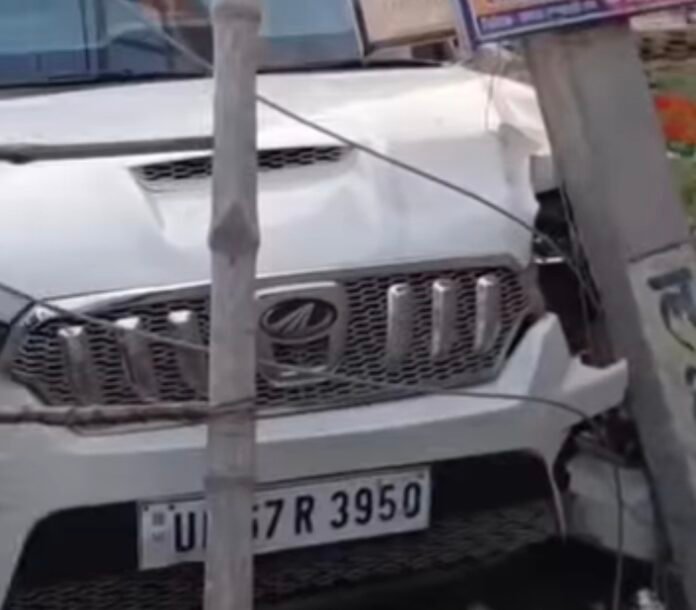 अनियंत्रित स्कार्पियों बिजली पोल से टकराया बाल बाल बचे सवार