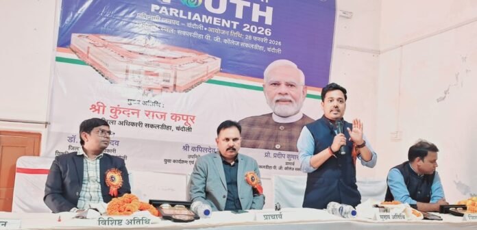 सकलडीहा। सकलडीहा पी. जी. कॉलेज में शनिवार को विकसित भारत यूथ पार्लियामेंट 2026 का सफल आयोजन किया गया। कार्यक्रम केतहत युवाओं में लोकतांत्रिक मूल्यों, संसदीय परम्पराओं तथा राष्ट्र निर्माण के प्रति जागरूकता विकसित करना रहा। यह कार्यक्रम युवा कार्यक्रम एवं खेल मंत्रालय, भारत सरकार के निर्देशन में आयोजित किया गया। जो प्रधानमंत्री नरेंद्र मोदी के विकसित भारत के संकल्प से प्रेरित है।