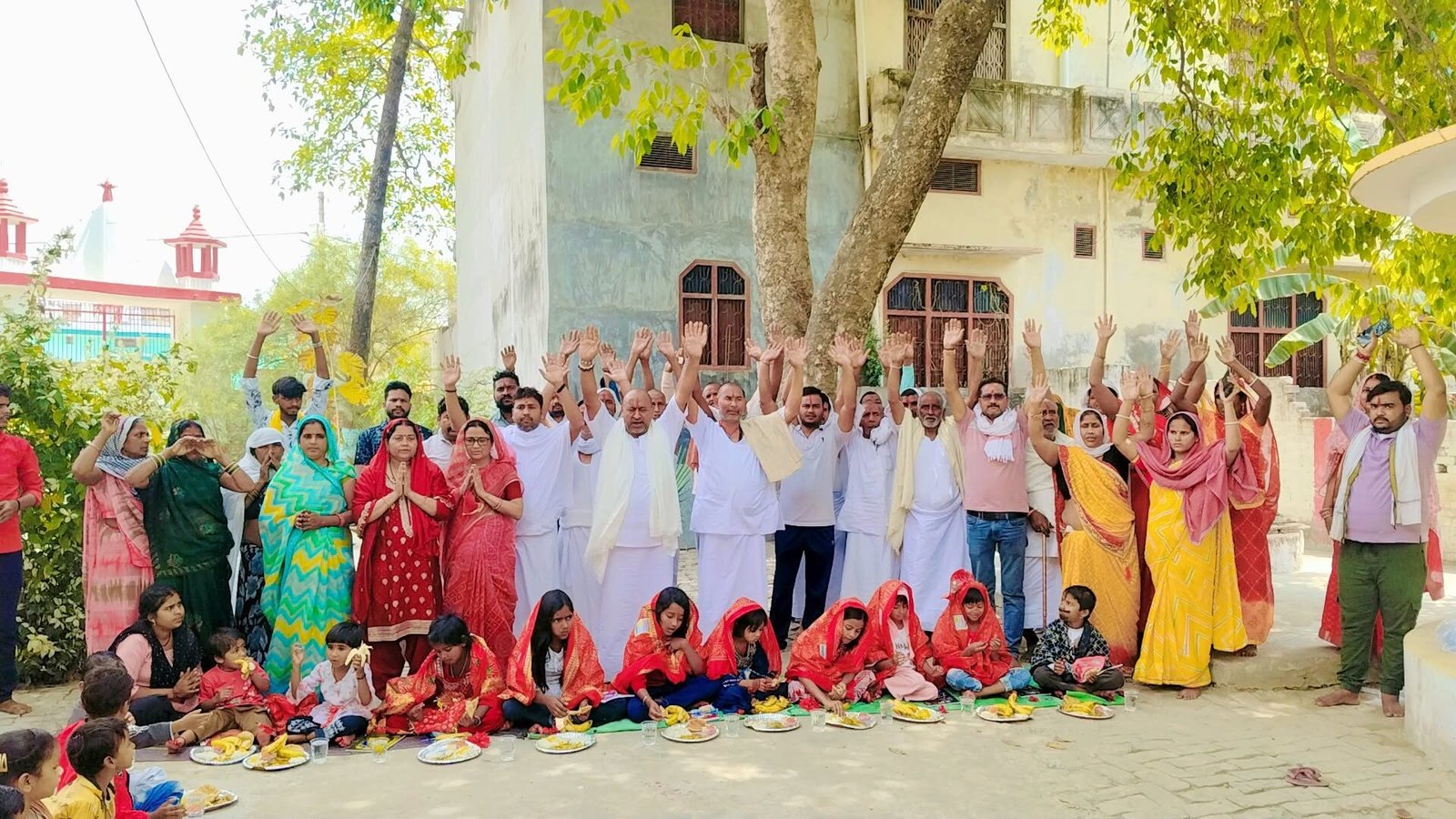 कस्बा के अभेद आश्रम में नवकन्या पूजा के दौरान जयकारा लगाते हुए भक्तजन