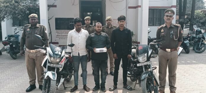चन्दौली पुलिस अधीक्षक आदित्य लांग्हे के निर्देशानुसार जनपद मे अपराध व अपराधियों के विरूद्ध चलाये जा रहे अभियान के क्रम में पुलिस अधीक्षक आपरेशन अनिल कुमार यादव व क्षेत्राधिकारी सदर राजेश राय के पर्यवेक्षण में प्रभारी निरीक्षक विन्देश्वर प्रसाद पाण्डेय व उनकी टीम द्वारा मोटरसाइकिल लूट की घटना का सफल अनावरण करते हुए लूट की मोटरसाइकिल सहित 3 अभियुक्तों को गिरफ्तार किया।