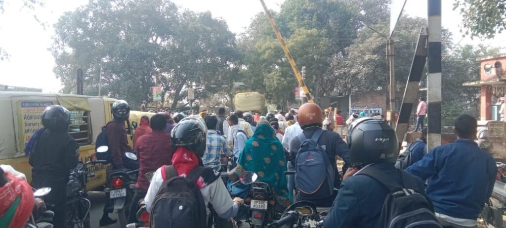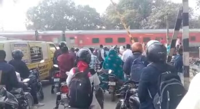 भोजापुर रेलवे क्रासिंग का रेलवे फाटक एक तरफ खुला रहा एक तरफ बंद और गुजरती रही ट्रेन।