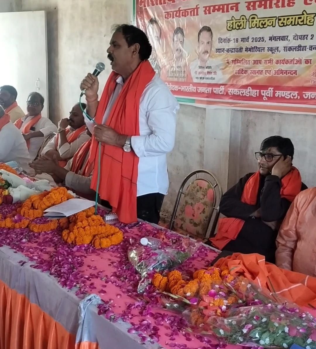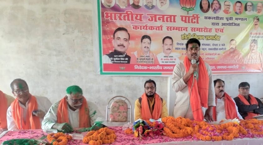 भाजपा की ओर से होली मिलन समारोह का आयोजनहोली मिलन समारोह में बोलते ब्लॉक प्रमुख अवधेश कुमार सिंह उपस्थित भाजपाजनसकलडीहा।कस्बा के निजी विद्यालय पर भाजपा की ओर से होली मिलन समारोह का आयोजन किया गया। भाजपा नेता सूर्यमुनी तिवारी और विशिष्ट अतिथि ब्लाक प्रमुख अवधेश सिंह ने कार्यकर्ताओं और नेताओं को रंग गुलाल लगाकर होली की बधाई दिया। वही कवि शैलेन्द्र पाण्डेय एडवोकेट ने विभिन्न फाग गीतों और व्यंग के जरिए समा बाध दिया।