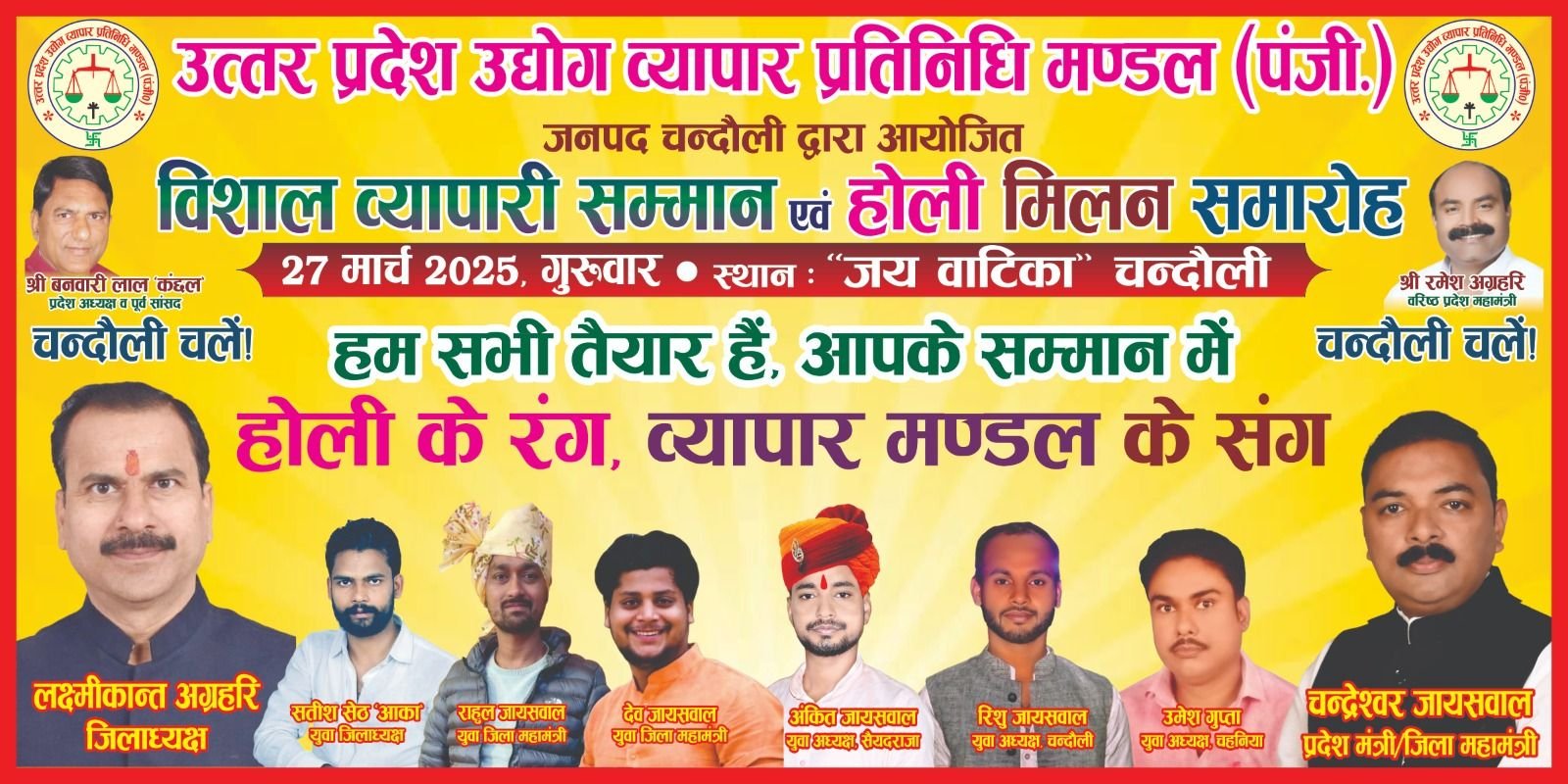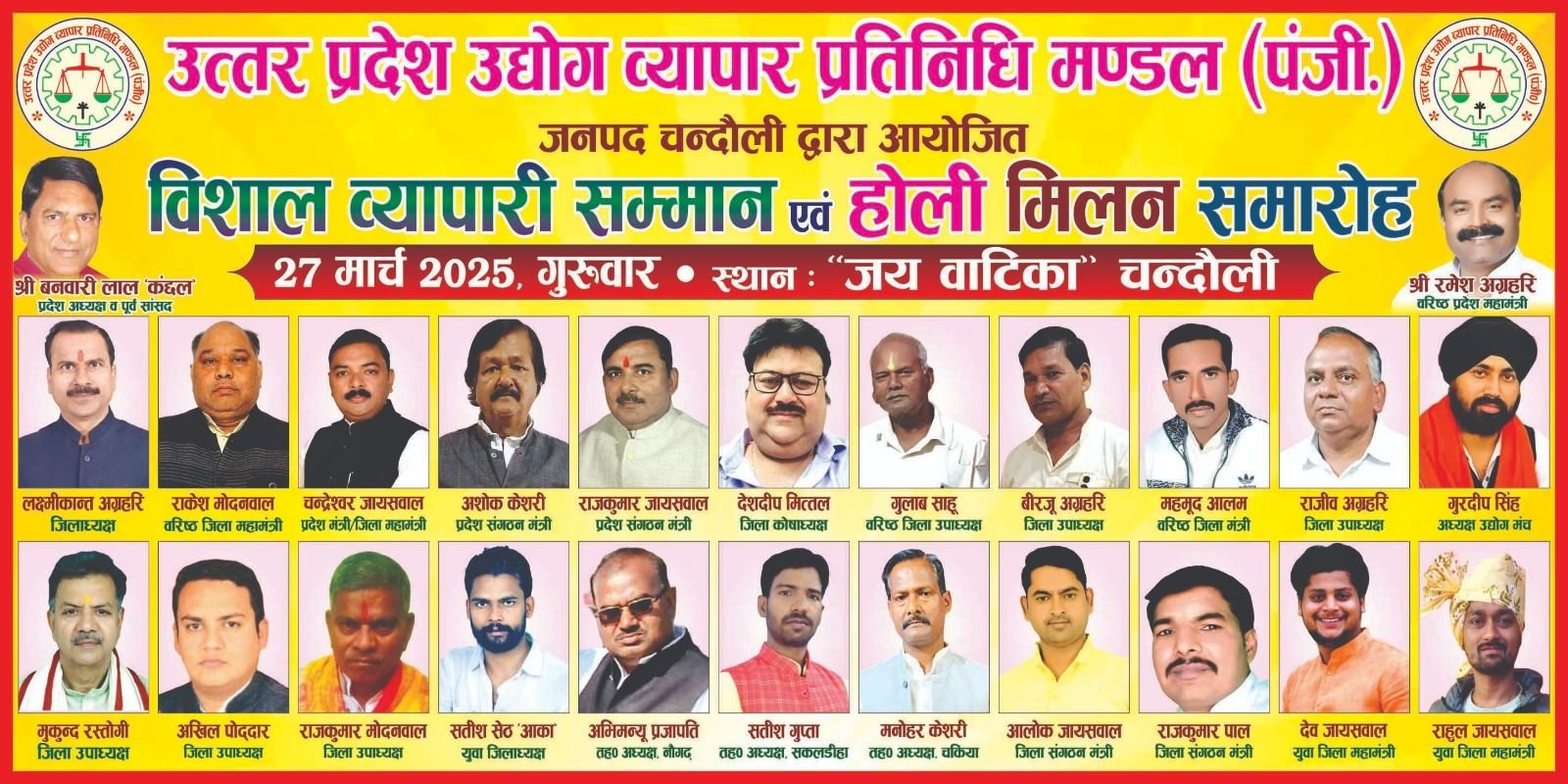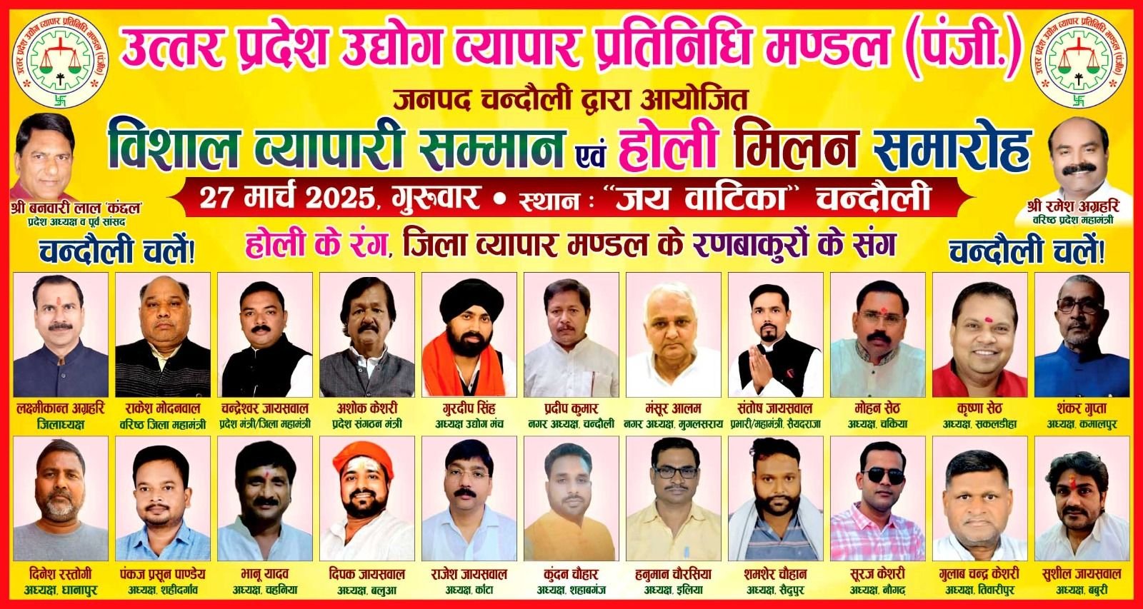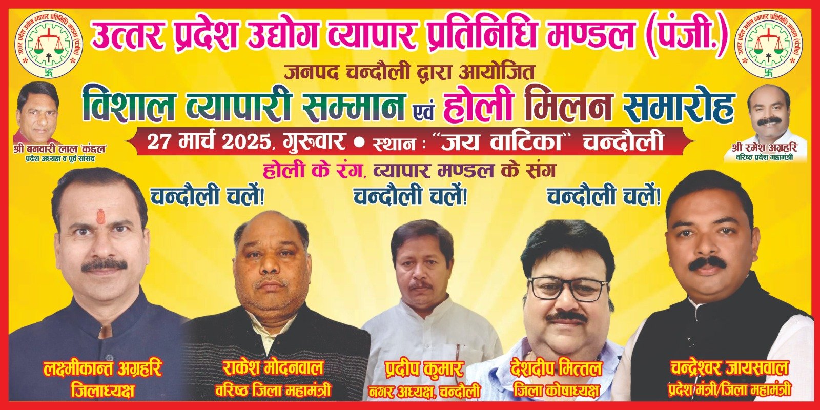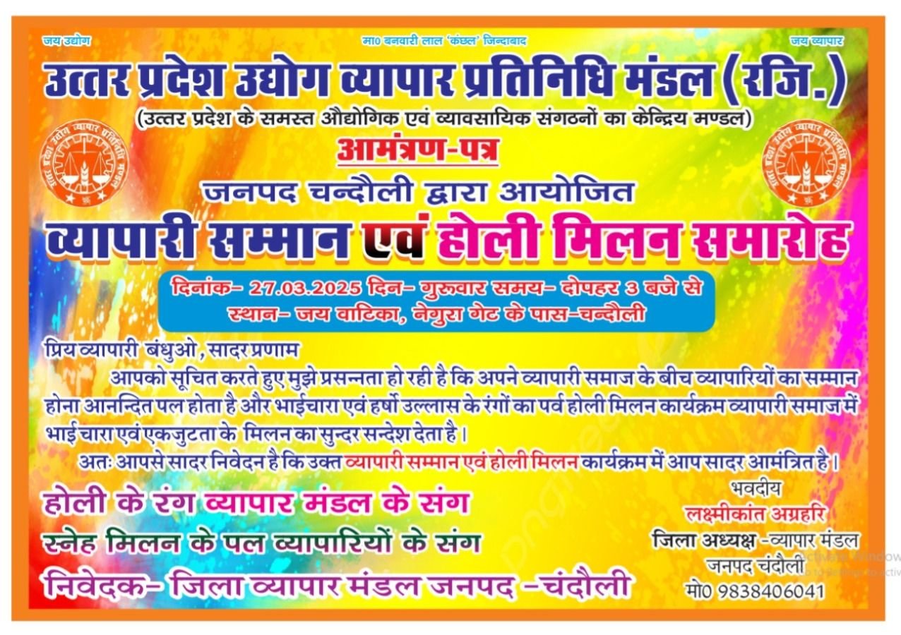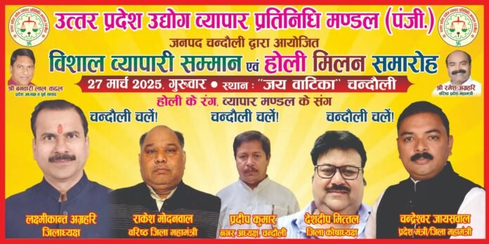 सकलडीहा। उत्तर प्रदेश उद्योग व्यापार प्रतिनिधि मंडल की ओर से आगामी 25 मार्च को चंदौली जिला मुख्यालय व्यापारी सम्मान समारोह और होली मिलन समारोह का आयोजन जिलाध्यक्ष लक्ष्मीकांत अग्रहरी के नेतृत्व में होगा। इसको लेकर जिले भर के सभी बाजारों के अध्यक्ष की ओर से जोर शोर से तैयारी शुरू कर दिया गया है। सम्मान समारोह के प्रदेश अध्यक्ष बनवारी लाल कंछल मुख्य अतिथि के रूप में शामिल होंगे।